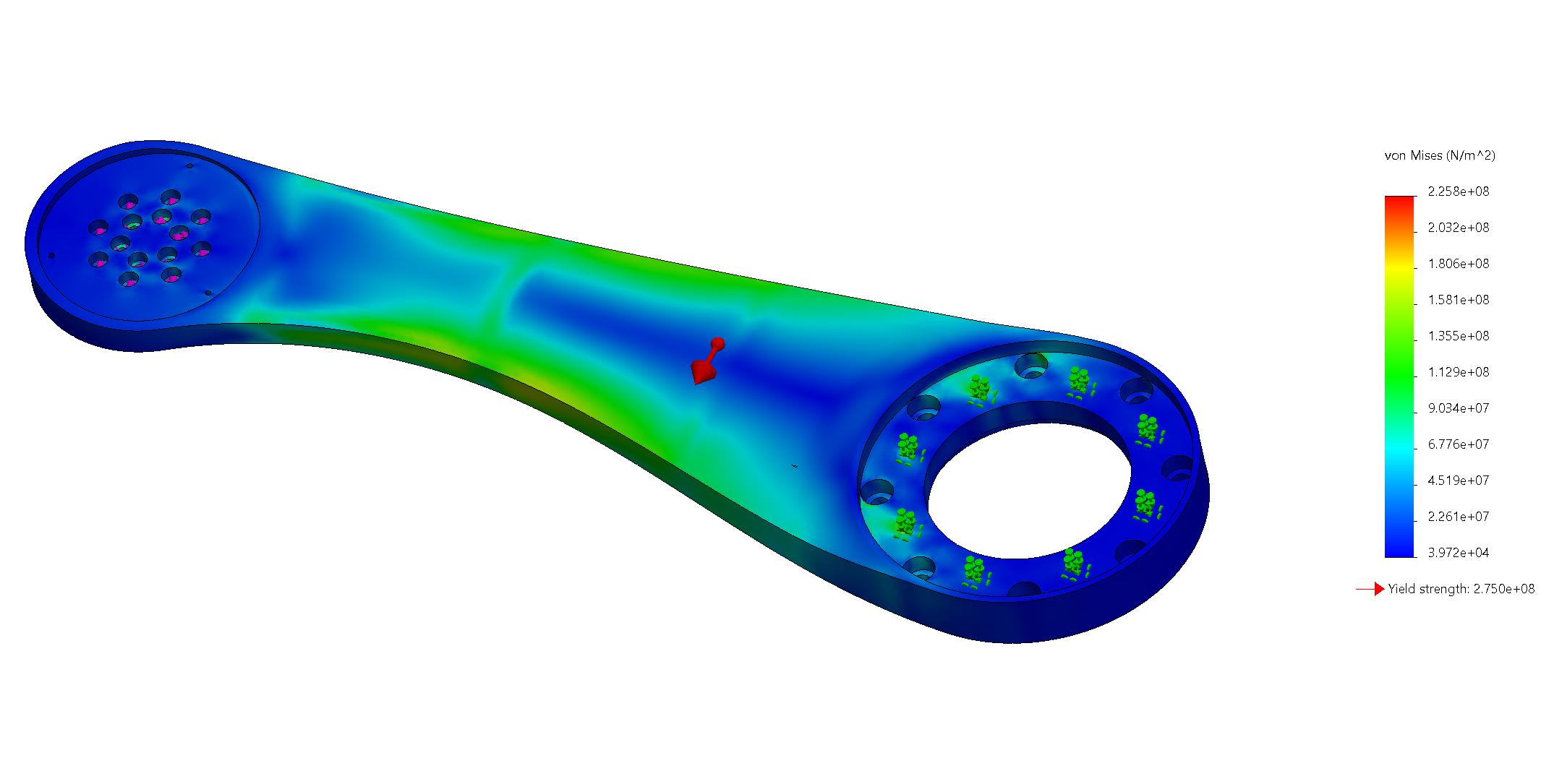 I first conducted static FEA simulations of the arms of the robot, since I was worried that the holes would shear off or deform from the high torques. For input forces, I would always put the predicted torque forces in the screw holes, and I would also put a directional force for gravitational and acceleration loads. I would test with a Factor of Safety of 2, with the applied load being around 4x the static gravitational load of the components. The two components were able to pass with flying colors. I might have gone overkill in ensuring the parts could handle the loads! Even if there is a lot of weight, it would cost much more for me to actually add operations to carve out the arms, and so I left it as a solid piece.