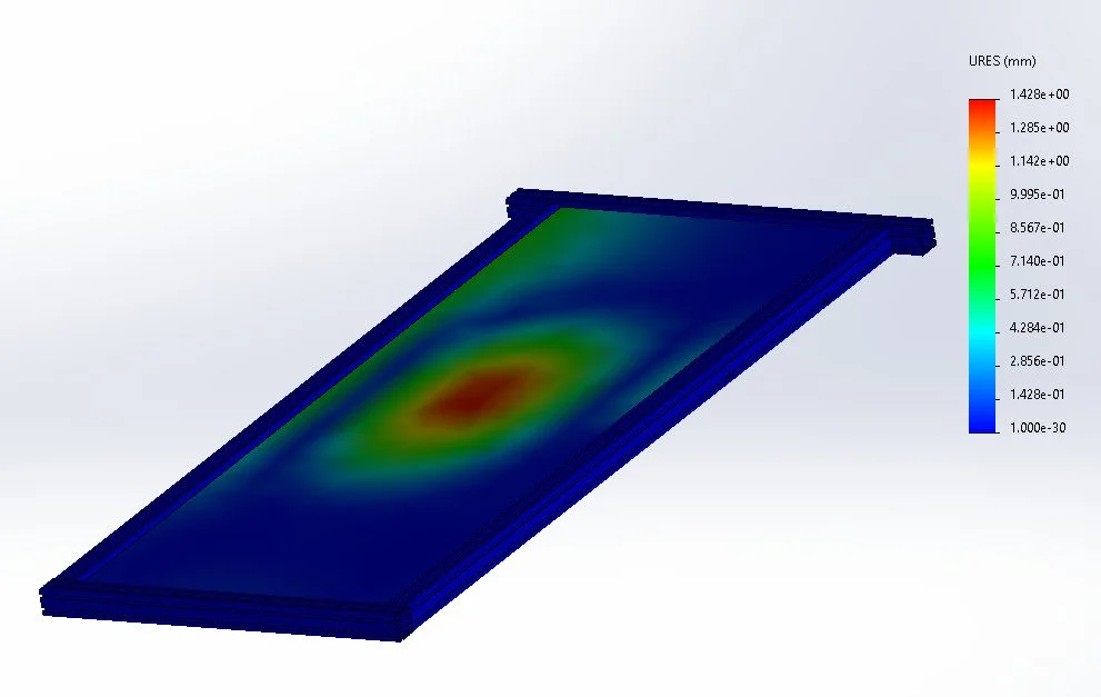 I led the structural simulation work to ensure the walkway would safely support a user at maximum incline. I used SolidWorks Simulation to run multiple FEA studies on the acrylic plate, aluminum frame, and gym bench under a 1000-lb load case. The forces were usually input onto a small rectangular section that is approximately the size of a human foot on different parts that would mimic the force concentration of a walking motion. These simulations helped us determine the optimal acrylic thickness and the strength of the 8020 bars and gym benches. I had to learn how to refine mesh strategies and boundary conditions so our results better reflected real-world scenarios without taking too much time. Even though they were static simulations, we ensured that we used an adequate factor of safety to compensate.