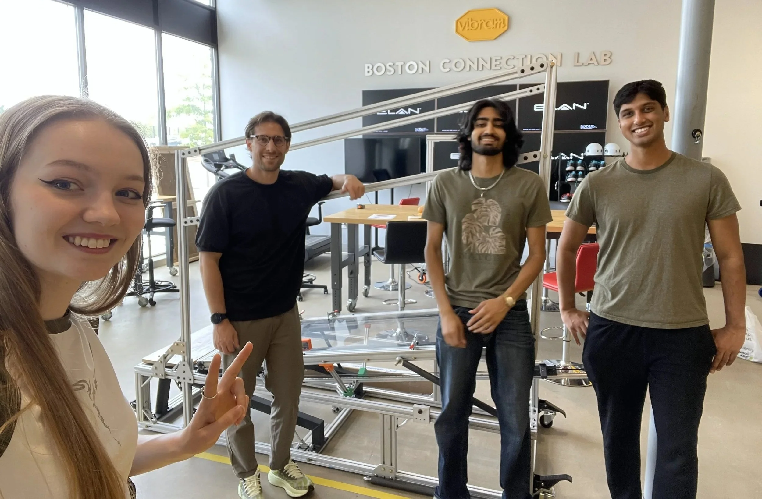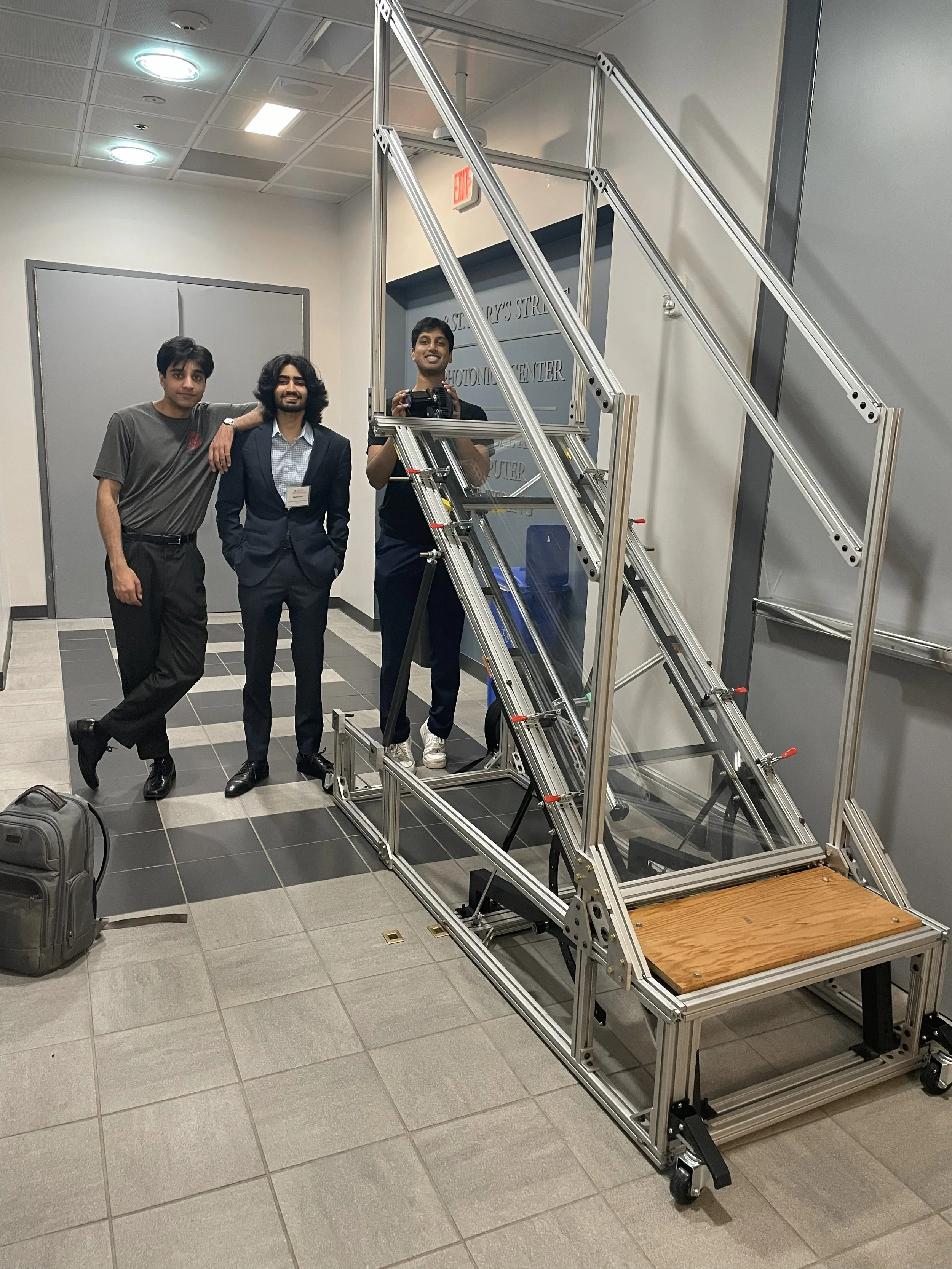 For my senior capstone in Mechanical Engineering at BU, I worked on a sponsored project with Vibram in a team of 5 to design and build an inclinable transparent walkway for footwear testing. The goal was to create a device that allows engineers to observe how shoe soles deform and grip surfaces while walking at different angles. Since no commercial solution existed, our team designed a fully custom mechanical system from the ground up, focusing on safety and modularity. The final result was a functional prototype capable of supporting a 225lb person with a movable camera mount.