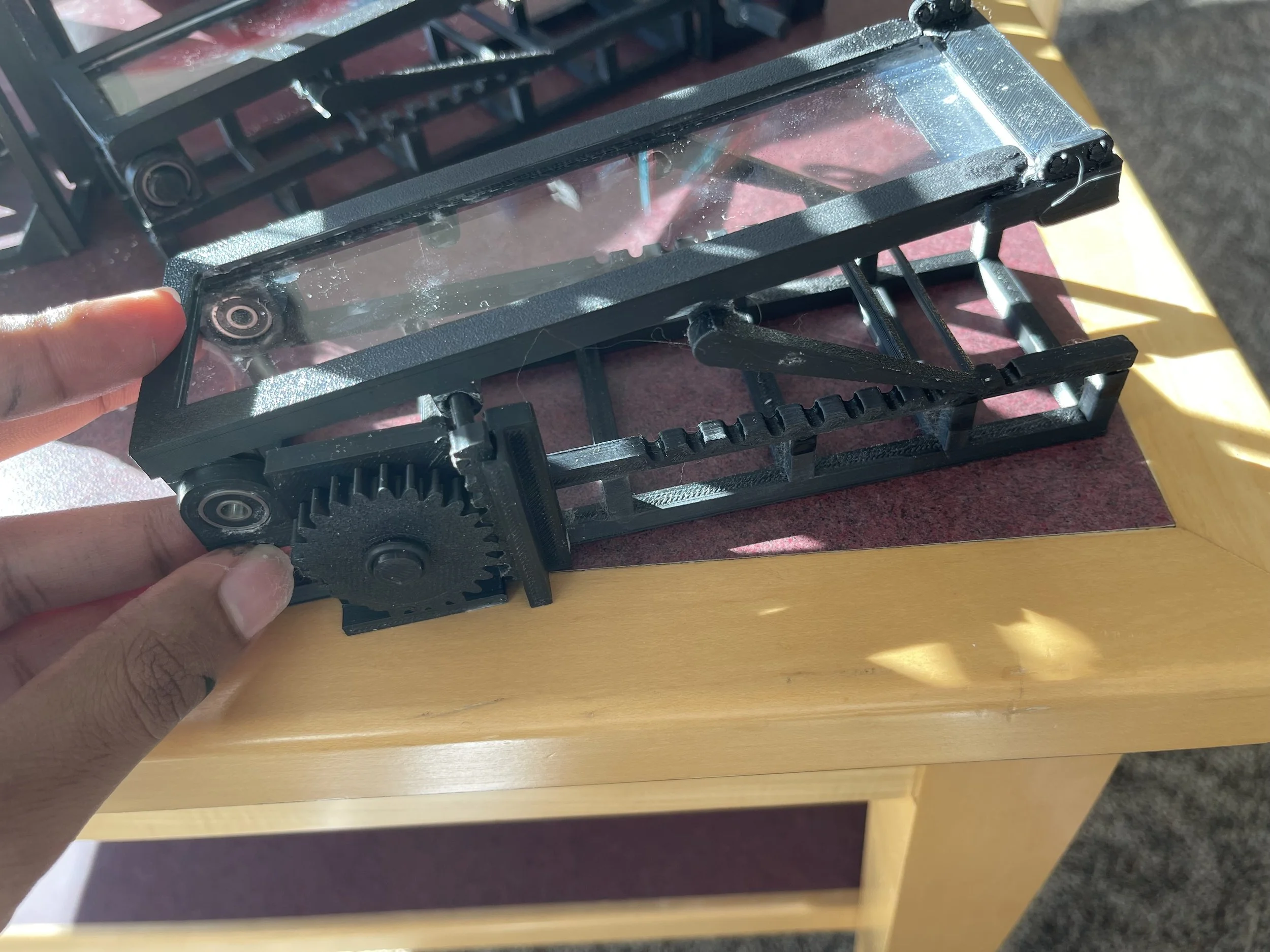 For the initial few months, we had been thinking of many ideas for lifting the device, and we were unsure of what to pick.  We thought of elevator-like pulleys or winches to lift the device, or manual hydraulic jacks at the base, or a simple arm stand used in gym benches that slots into some metal grooves. We had so many meetings of rough calculations of beam strengths, and doing rough drawings of possible designs and ideas. Finally, I created 3D-printed mini models to illustrate our ideas and provide a clearer picture to our sponsors. This helped a lot; our sponsors told us more in-depth specifications and helped us narrow down our ideas after our meeting, where I presented these models to them!