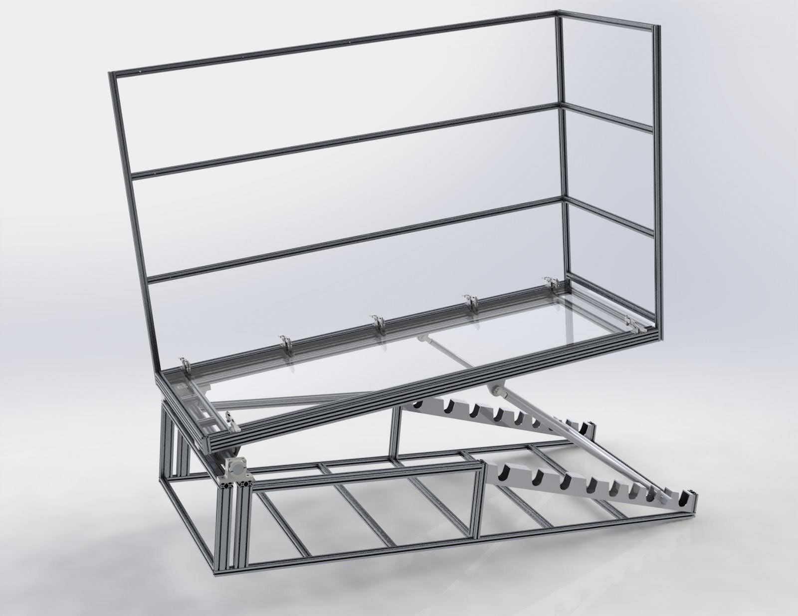 Our team devised a final model that would have the gym bench at the front of the device to serve as a pivot point and utilize safety struts for securing the angle of the frame at increments of 10 degrees. The frame would be lifted up and down by hand with the assistance of 2 gas struts that each exert 100 pounds of force upwards. There is a large linear rail at the bottom of the device that is held to the frame by 3d printed connectors, and the camera mount sits on top of the rail and is belt-driven. The camera can be positioned at any section below the acrylic as per the user’s wish. The acrylic plate is placed in the frame and held in place by a total of 8 toggle clamps. The handlebars are uniquely in a parallelogram format that utilizes 10 hinges. The reason for this design decision is so that the user can have more space while walking at the end of the walkway, since a fixed handlebar that is always perpendicular to the frame will point towards the user’s head at higher inclines and limit the available space. I made a 360 animation and a photoview render of the design, which can be seen below.